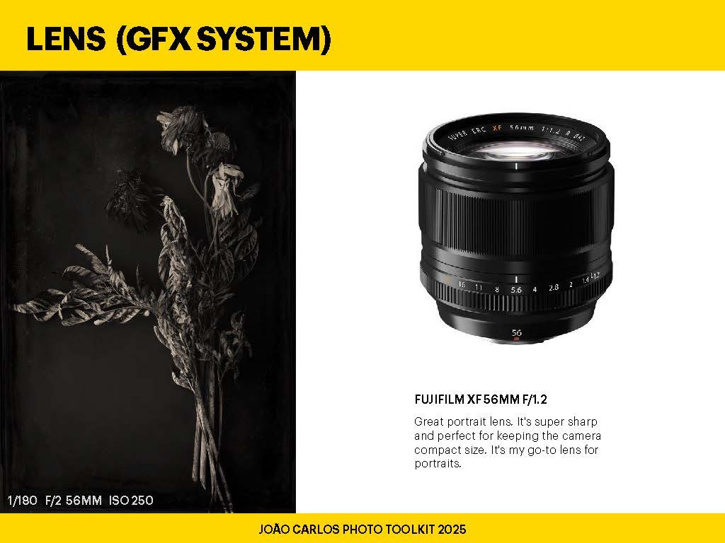 After years of shooting everything from fashion to fine art, I’ve built a lens kit that gives me creative control, portability, and precision. Each lens here earns its place in my bag—not just for its specs, but for how it helps tell the story. Whether I’m working with medium format or the X Series, these lenses support my visual language..