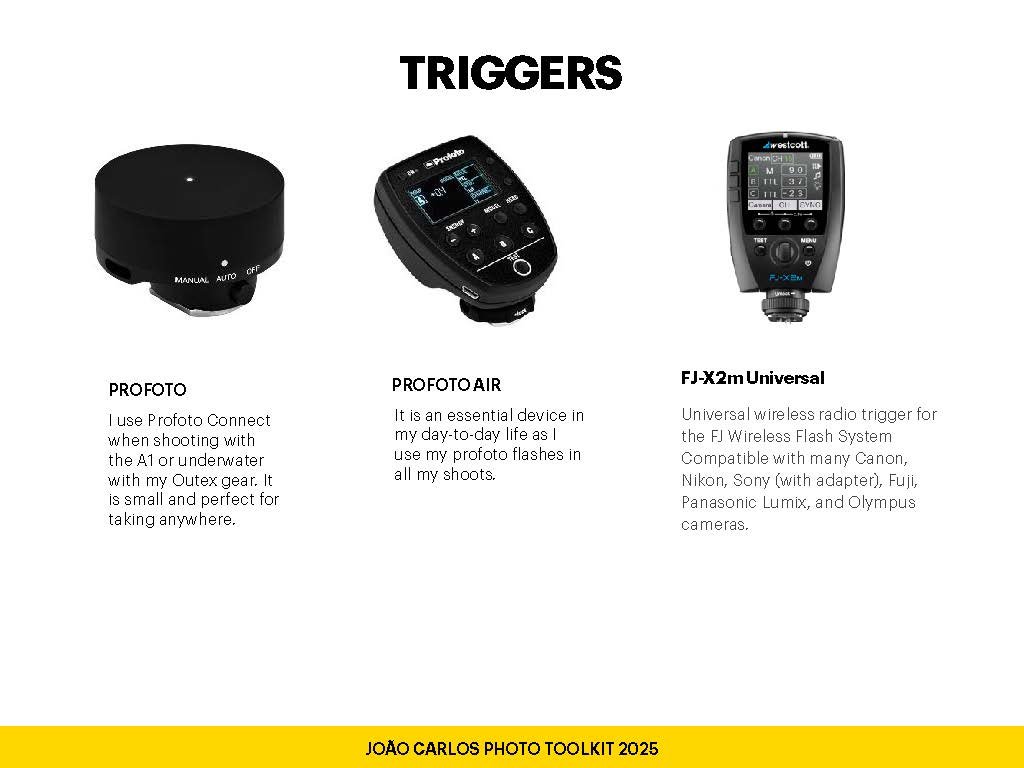 Good light starts with a good connection. Triggers are a critical part of my setup—ensuring every flash fires exactly when and how I want it to. Whether I’m shooting in the studio, underwater, or on location, these tools keep my lighting synced and my workflow smooth. Profoto Connect