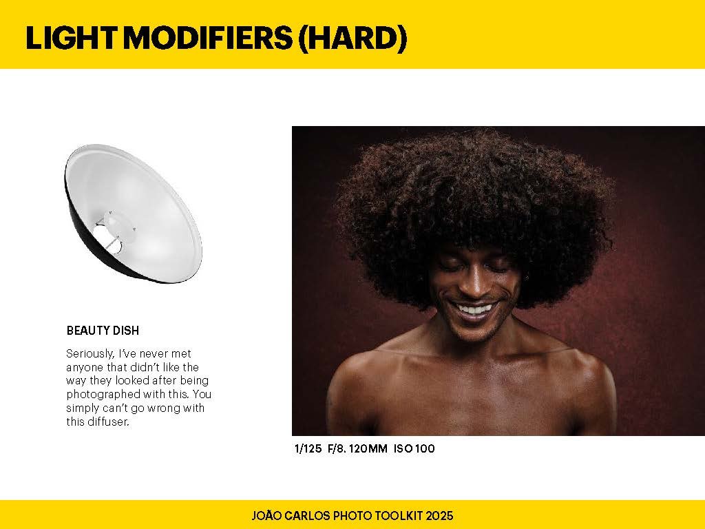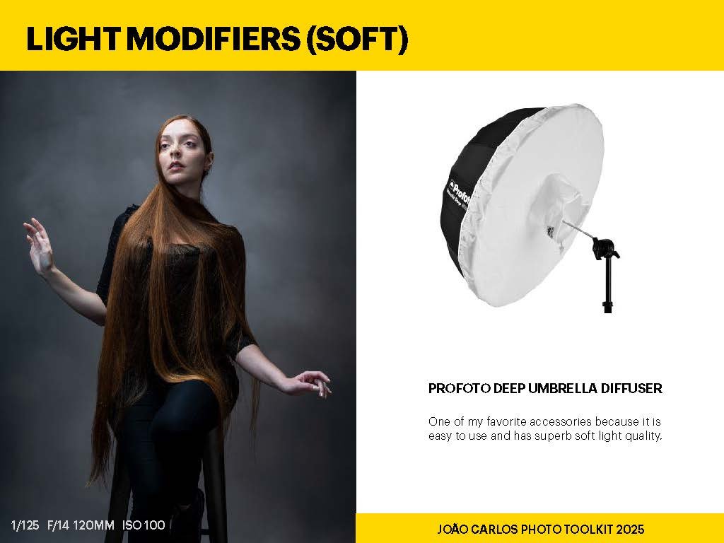 Light is everything — but how you shape it is what defines your style. Light modifiers are the tools I use to control softness, direction, and contrast. Whether I’m shooting a polished fashion editorial, a raw portrait, or a detailed product still, the right modifier makes all the difference. From softboxes and umbrellas to grids and beauty dishes, each piece in my kit serves a unique purpose. Some are compact and quick to set up on location, others are built for precision in the studio. What matters is knowing how to use them to bring your creative vision to life.