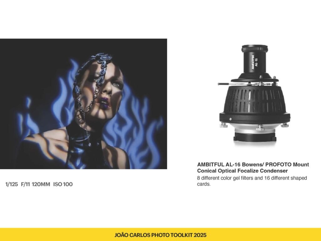 One of my favorite tools for adding drama and precision. This optical snoot-style condenser comes with 8 colored gels and 16 gobos, allowing me to project patterns or shapes with incredible focus. It’s perfect for creative portraits or theatrical lighting.