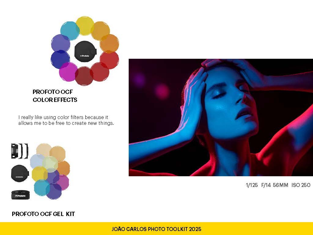 I love the creative freedom gels give me. Whether I’m adding subtle warmth, balancing color temperatures, or creating bold looks, these Profoto OCF gels help me shape mood and tone with light. They’re fast to mount and perfect for experimenting with color.