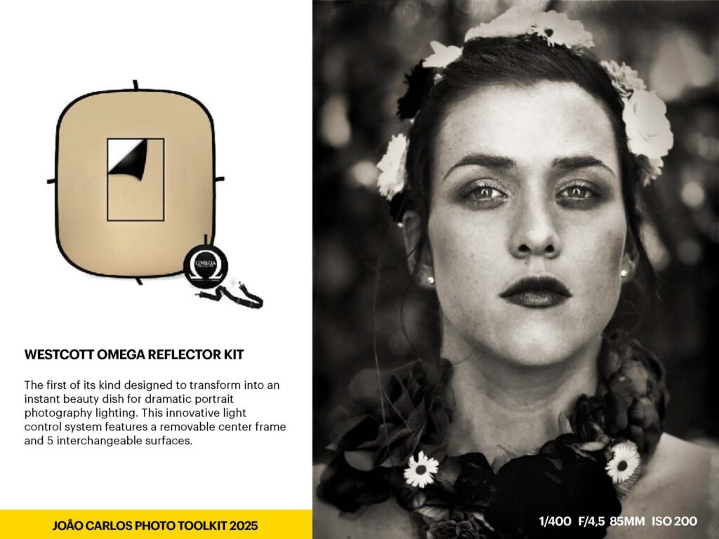 One of my favorite accessories. It’s fast to set up and gives beautiful, soft light — ideal for portraits or fashion shoots where skin tone and texture matter.