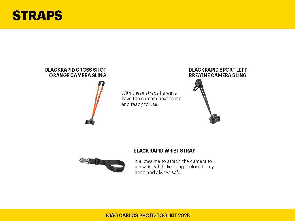 Having the right camera strap is all about comfort, speed, and peace of mind. Whether I’m on set, traveling, or shooting street style, straps keep my gear secure and ready to use at a moment’s notice. Here are a few I rely on most:
