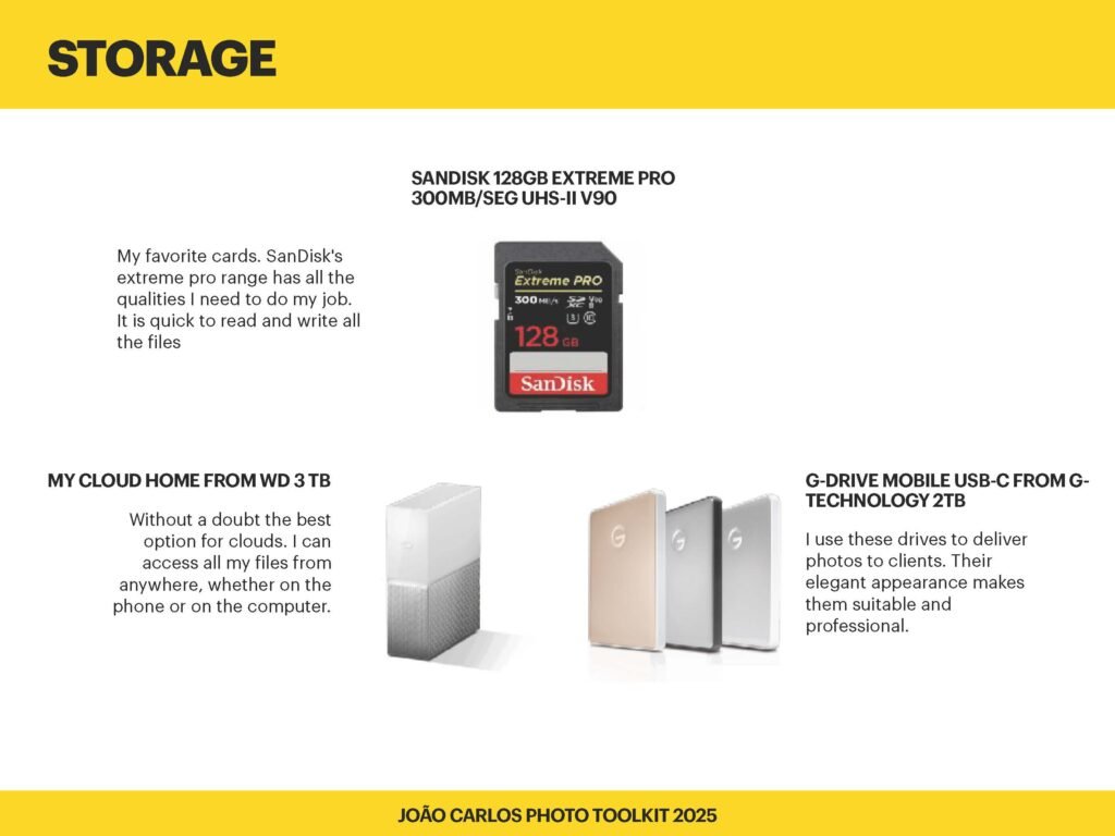 Storage is the backbone of any photographer’s workflow. From lightning-fast cards on set to rugged SSDs in the field and massive drives for long-term archiving, having a dependable system is non-negotiable. Over the years, I’ve built a storage workflow that’s secure, fast, and client-ready — both on the go and in the studio.