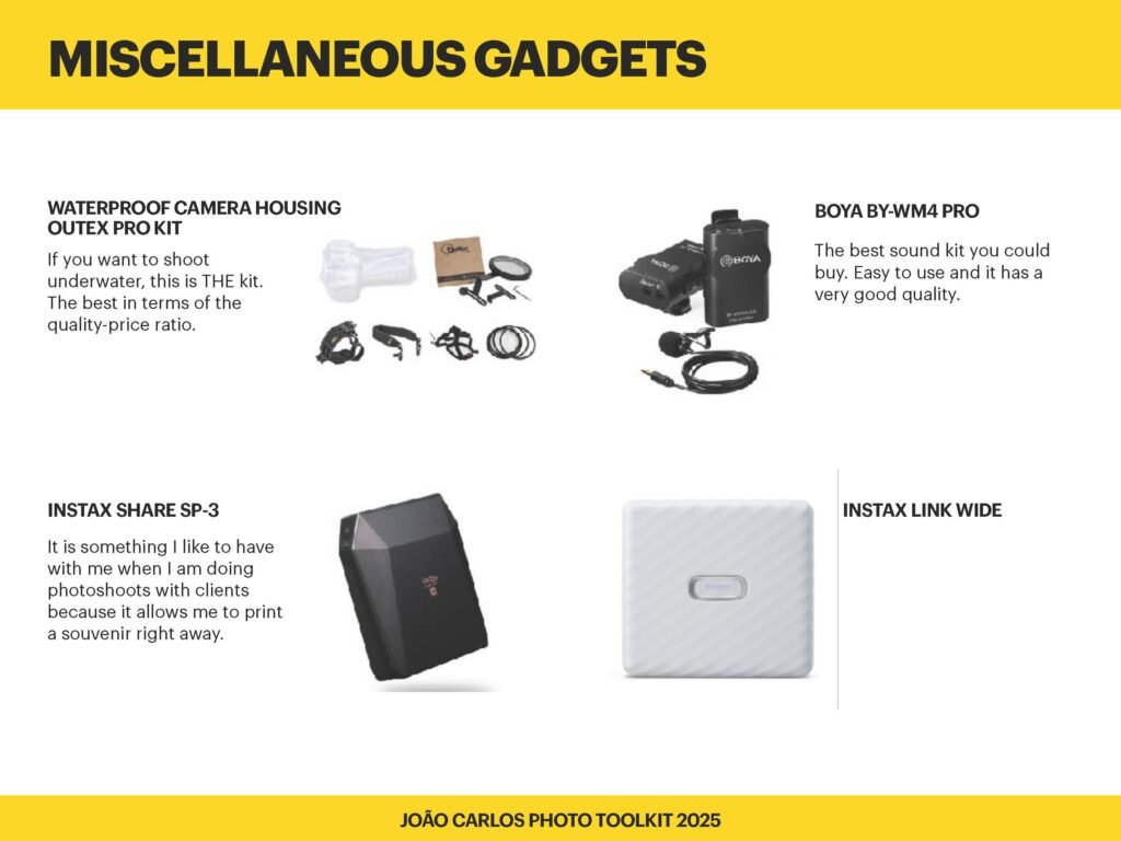 Sometimes it’s the smaller accessories that make the biggest difference. Whether it’s for video, waterproofing, printing souvenirs, or stabilizing your gear — this section covers those essential extras that support my creative process.